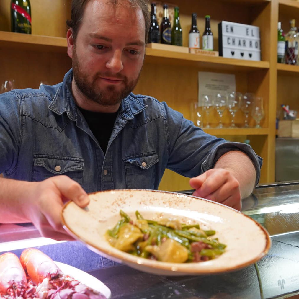 Rubén Jiménez, cocinero joven formado en la Escuela de Hostelería de Santo Domingo que después ha pasado por el Echaurren, el Tastavín y el Guardaviñas. Allá por 2019, emprendió su primera aventura en solitario en este emblemático emplazamiento.